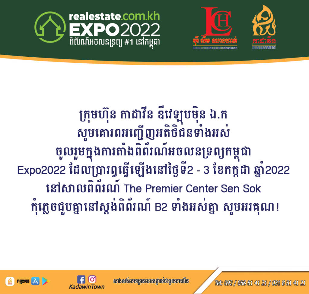 សូមគោរពអញ្ជើញអតិថិជនទាំងអស់ ចូលរួមក្នុងការតាំងពិព័រអចលនទ្រព្យកម្ពុជា EXPO2022 ដែលប្រារព្ធធ្វើឡើងនៅថ្ងៃទី 2-3 ខែកក្កដា ឆ្នាំ 2022 នៅសាលពិព័រណ៍ The Premier Center Sen Sok កុំភ្លេចជួបគ្នានៅស្តង់ពិព័រណ៍ B2 ទាំងអស់គ្នា សូមអរគុណ!